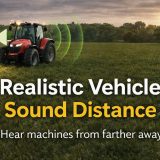 Функция «Реалистичная дальность звука двигателей» увеличивает расстояние, на котором слышны двигатели тракторов, грузовиков, комбайнов и другой сельскохозяйственной техники. Теперь работающие на вашей ферме машины будут слышны на гораздо большем расстоянии, создавая более захватывающую и реалистичную атмосферу фермерского хозяйства.