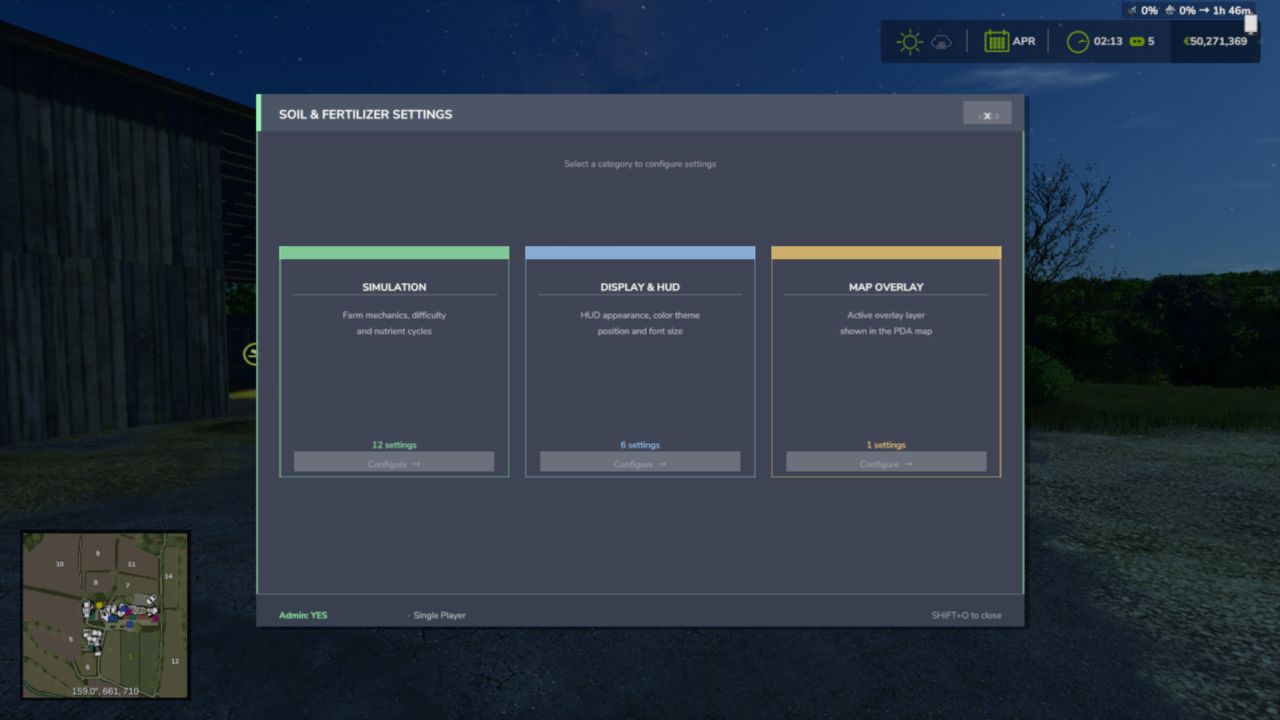 Все настройки находятся в игре в разделе «Почва и удобрения» в игровом меню. В многопользовательском режиме настройки игрового процесса контролируются администратором. Настройки интерфейса/отображения всегда задаются для каждого игрока отдельно.
