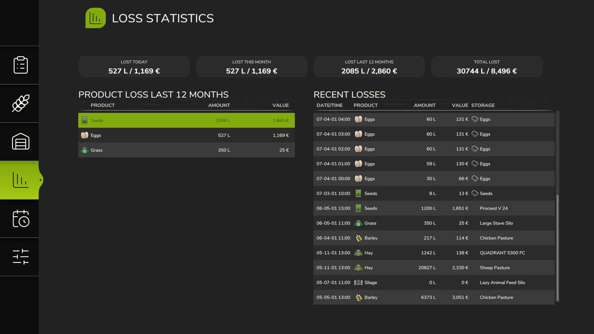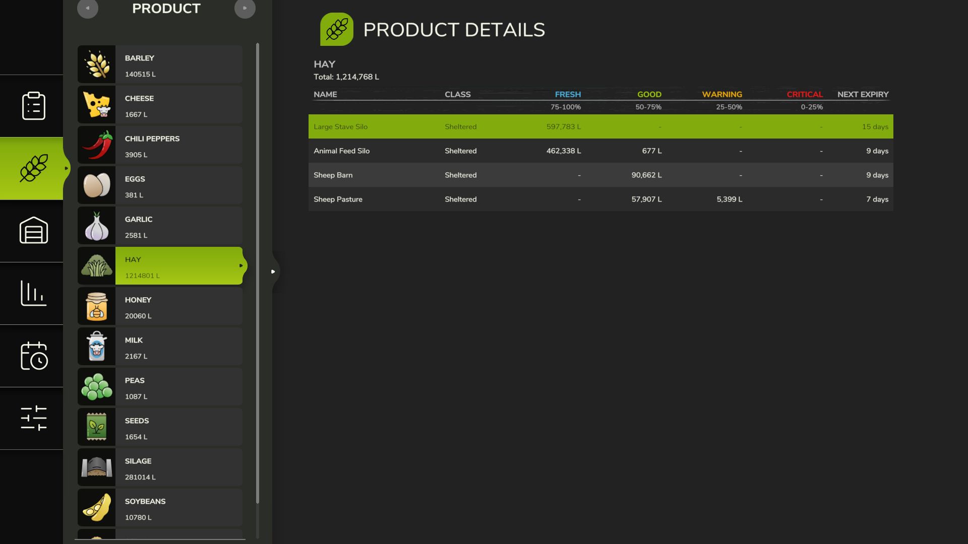 У собранного урожая, переработанных продуктов и прессованного корма теперь есть реалистичные сроки хранения — листовые овощи быстро портятся, а зерновые и консервы хранятся гораздо дольше. Если оставить продукты слишком долго лежать, они испортятся и будут потеряны! Настройте сроки хранения в меню «Свежие продукты».