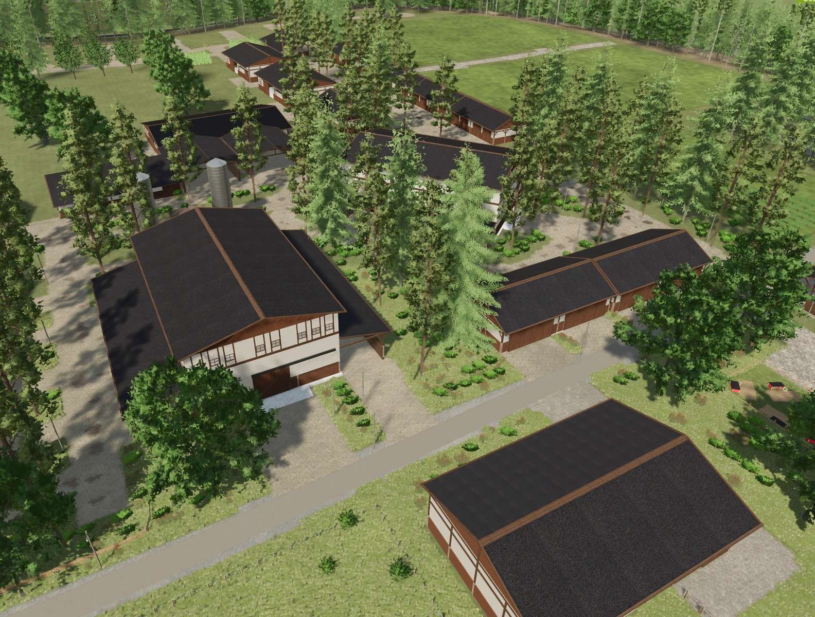 Классическая американская ферма с просторными амбарами, силосами и загонами для животных. Идеально подходит для крупномасштабного земледелия или в качестве основной фермы для многопользовательской игры.