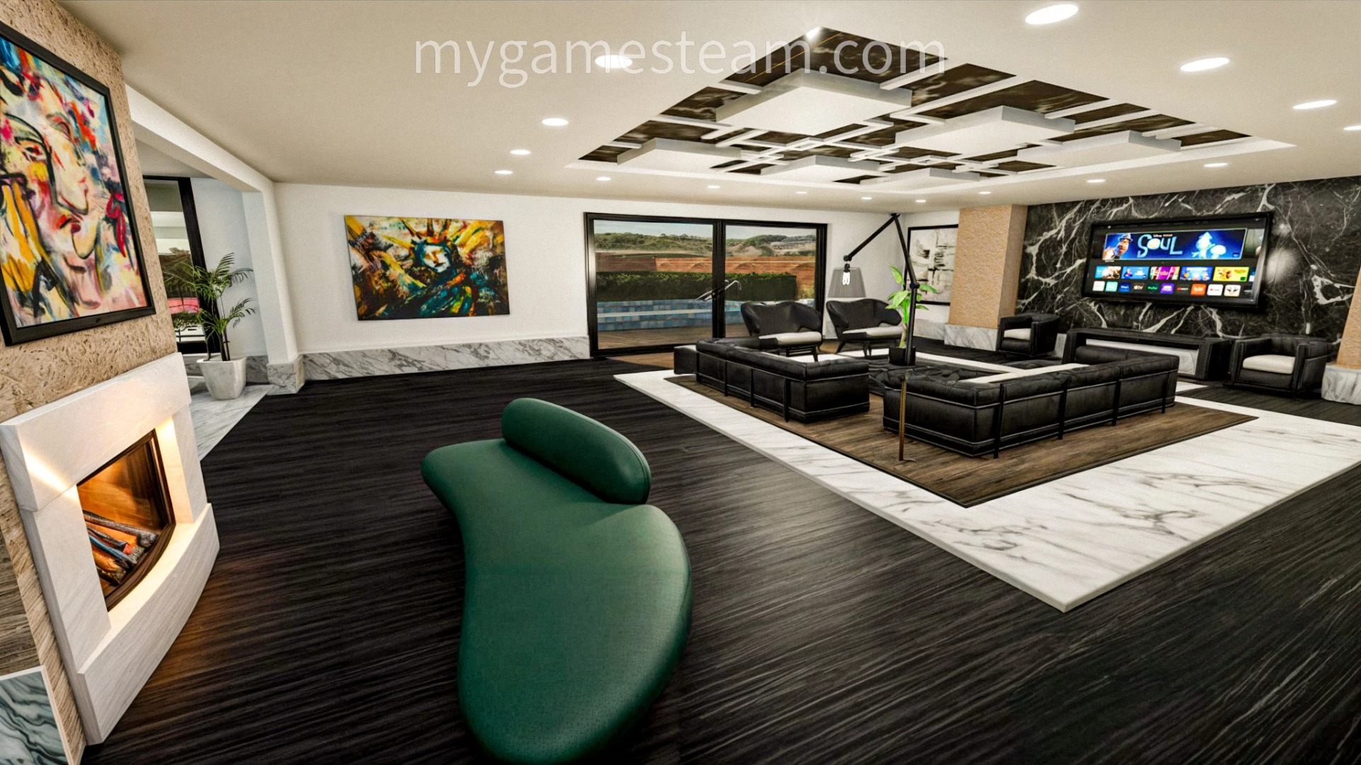 — Игровая комната с бильярдным столом и баром.