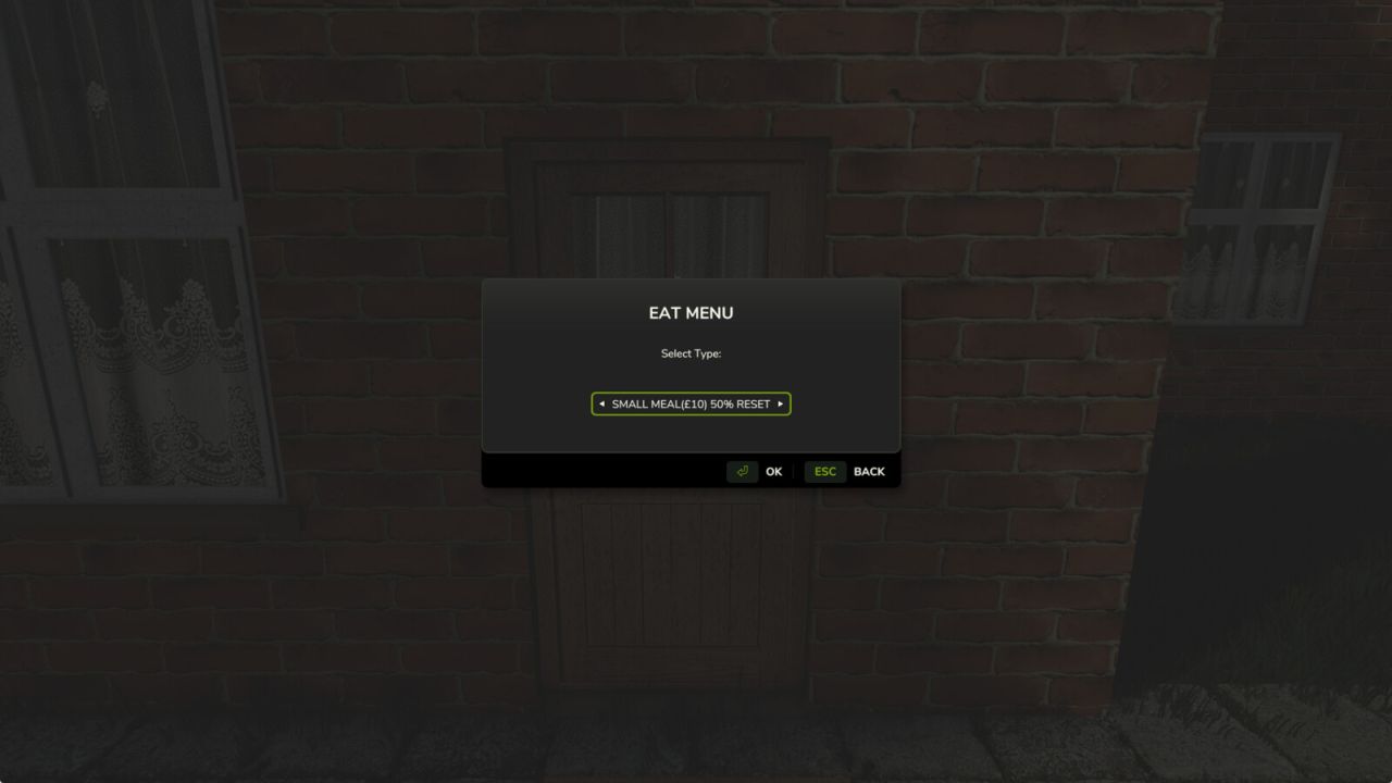 — Меню питания (полноценный обед / небольшой обед / легкий перекус) с ограничением по сложности.