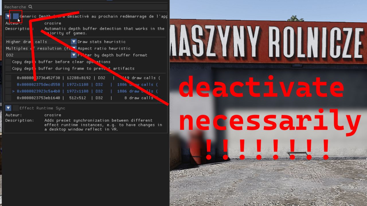 — Обязательное удаление параметра (Generic Depth) из настроек Reshade во вкладке (Дополнения), как показано на 4-м фото.