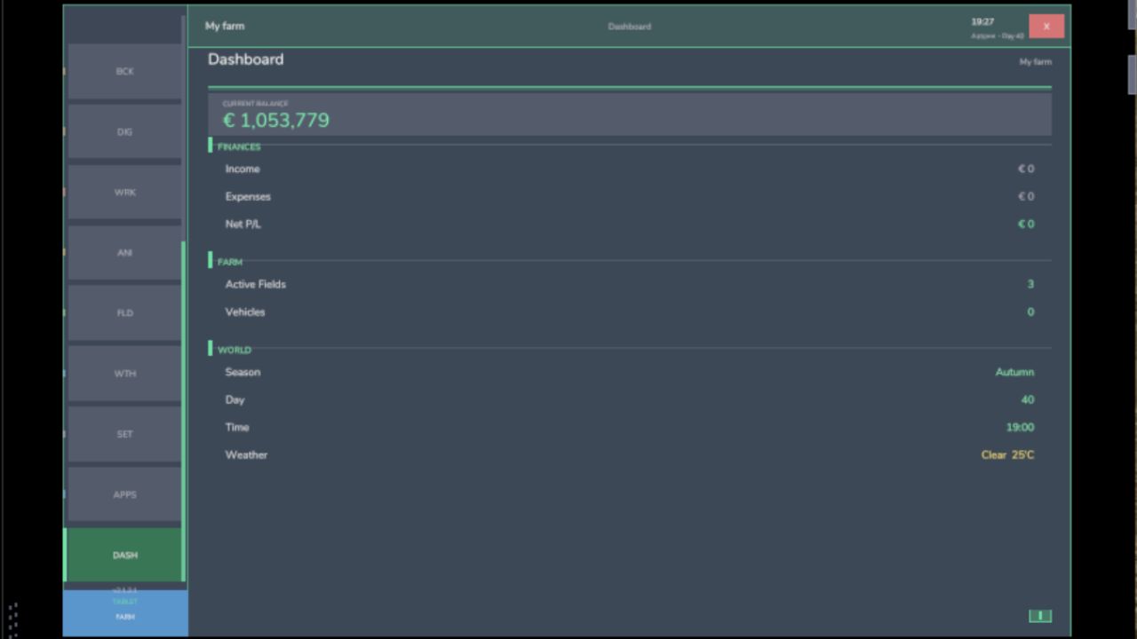 Изначально вдохновлённый модификацией для планшета для FS17, этот проект был создан с нуля для FS22, а теперь полностью переработан и адаптирован для FS25. Цель проста: полезная информация о ферме с первого взгляда, не мешающая игровому процессу.