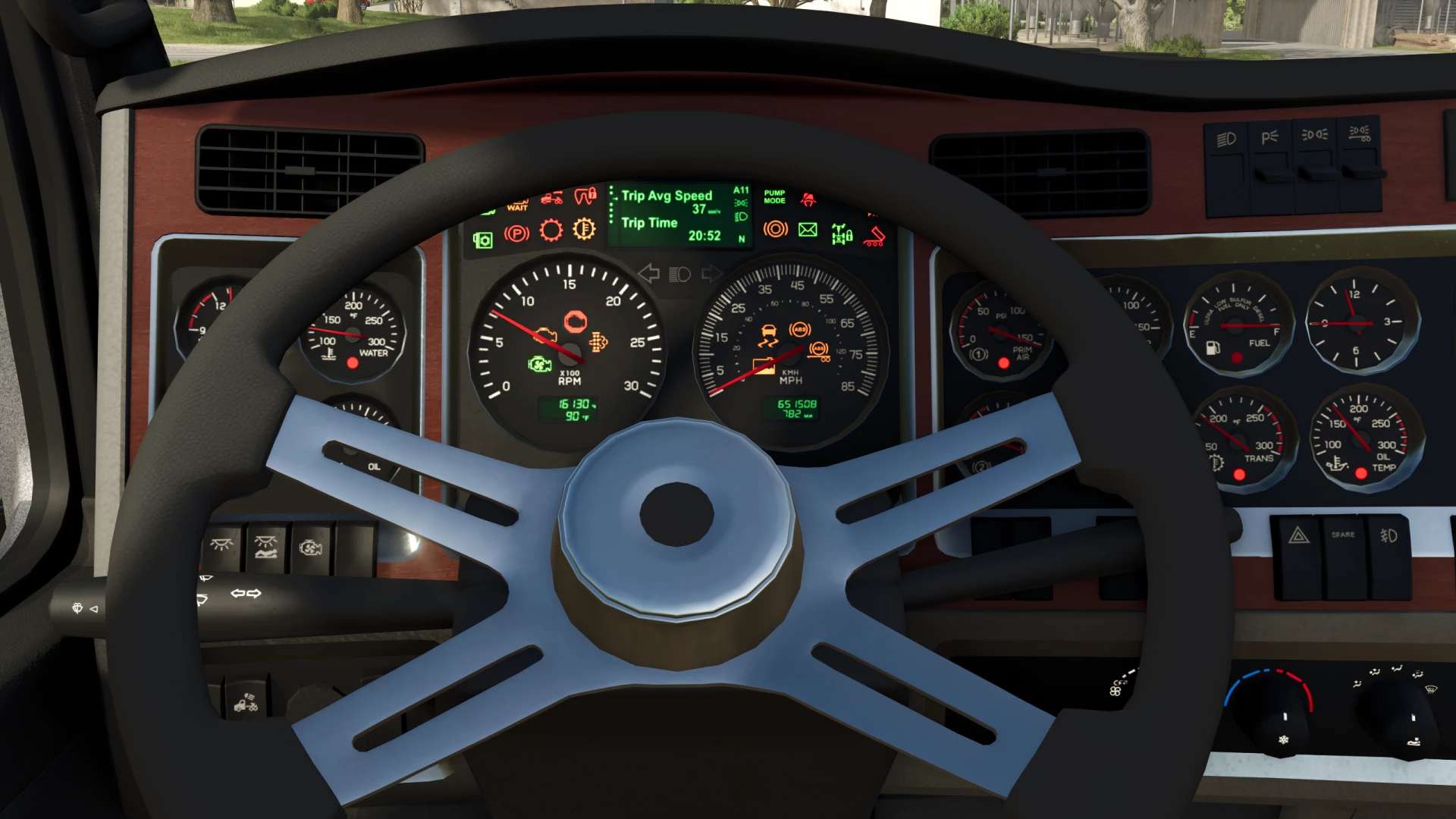 — Анимированная приборная панель, рычаг переключения передач, педали и переключатель поворотов.