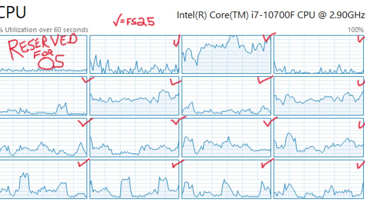 — Привязывает FS25 к лучшим ядрам ЦП (пропуская ядро 0, которое Windows использует для системных задач).