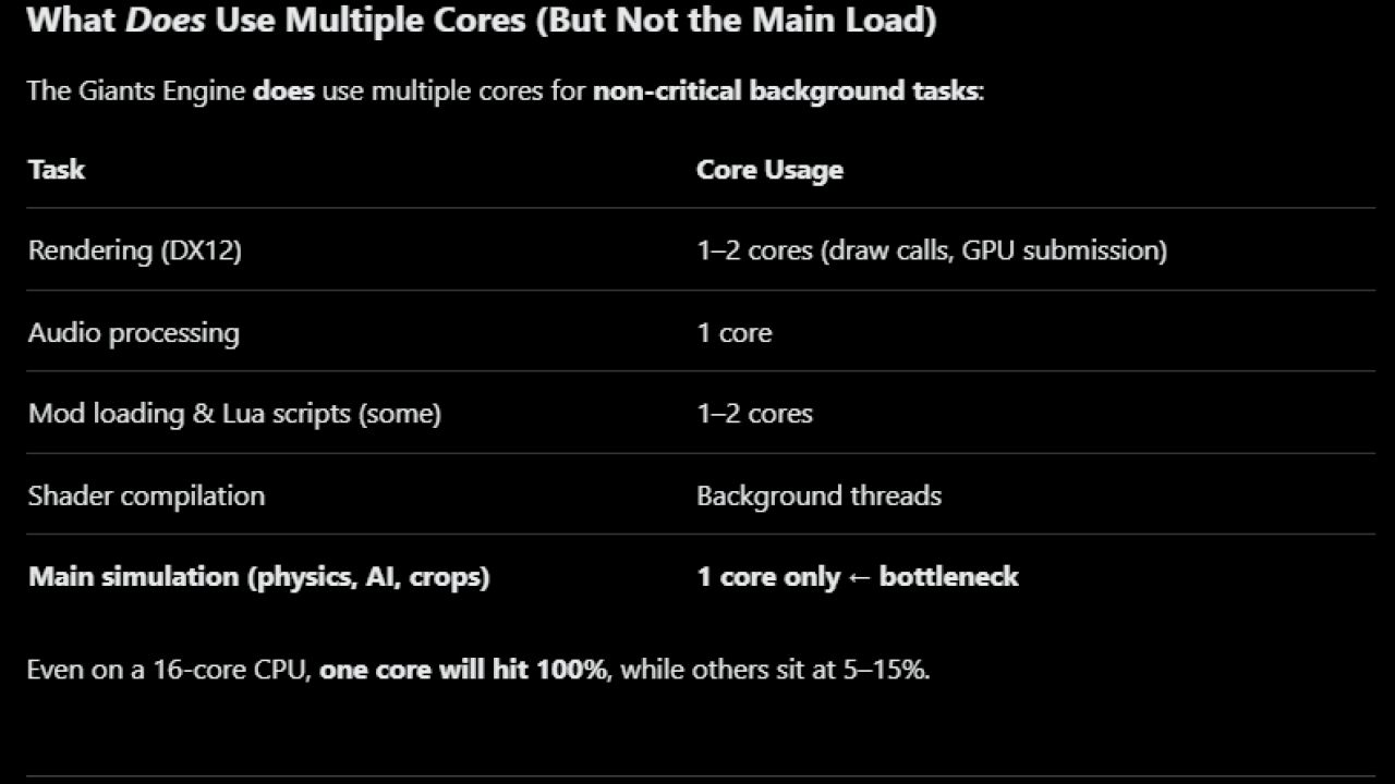 Это говорит о том, что важные части движка (например, симуляция, обновление объектов, логика дальности прорисовки) не полностью распараллелены.