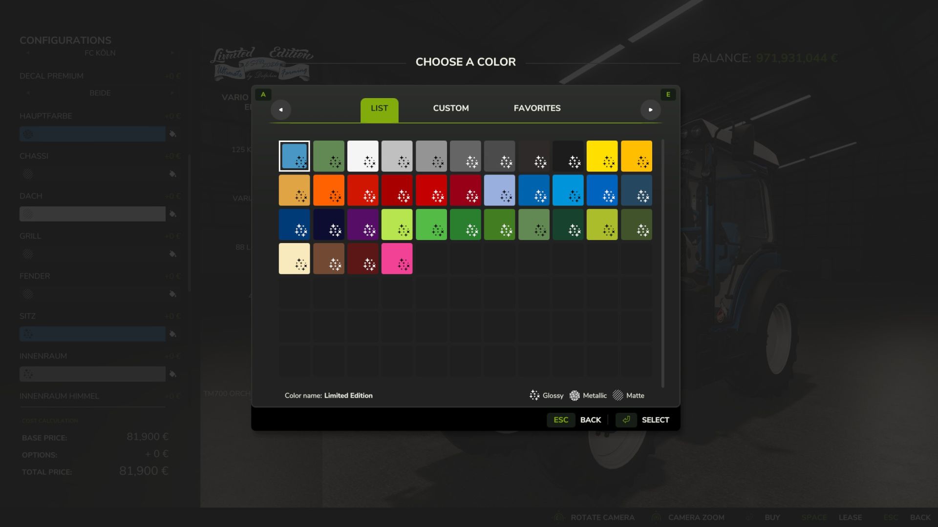Варианты цвета для основного цвета, шасси, крыши, решетки радиатора, крыльев, сидений, интерьера, потолка, рулевого колеса, ремней безопасности, подлокотника, кнопок подлокотника, надписей и цвета колес;